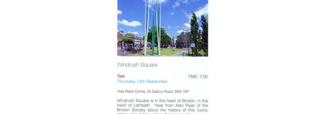 Our next event in the Lambeth Heritage Festival programme ( ) is a talk about “Windrush Square” by our Secretary, Alan Piper. It is tomorrow, Thursday 13th September at 7:00 pm in the Vida Walsh Centre, 2b Saltoun Road (opposite the Town Hall).